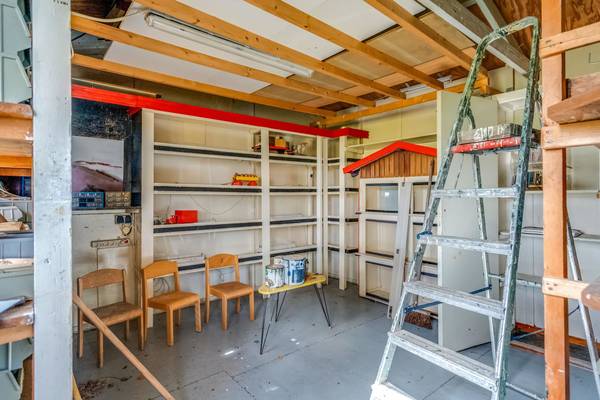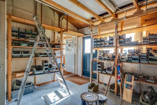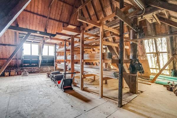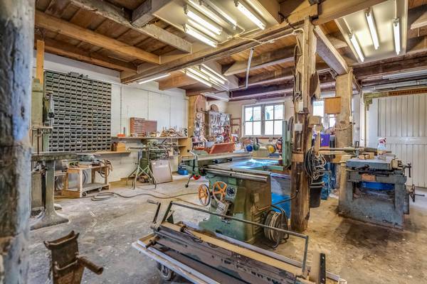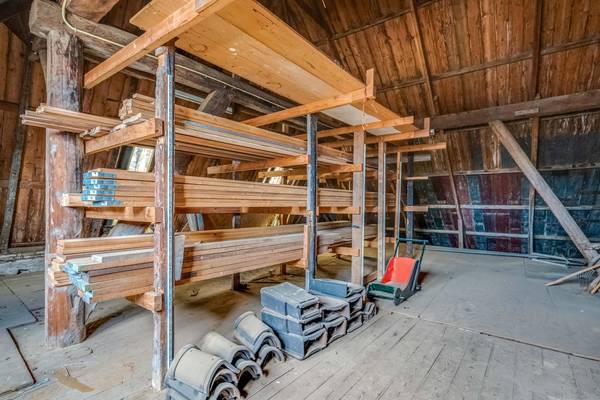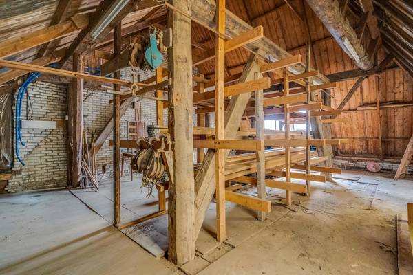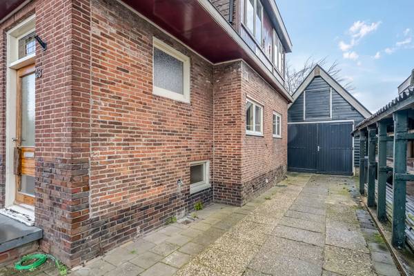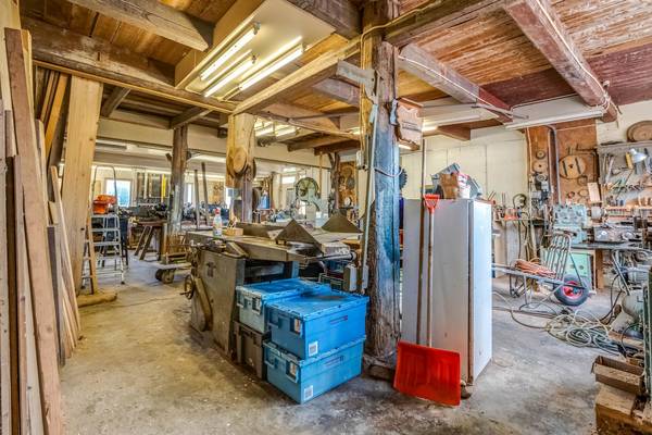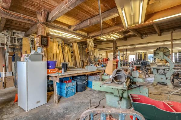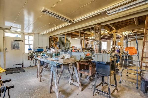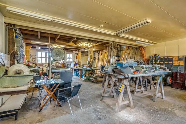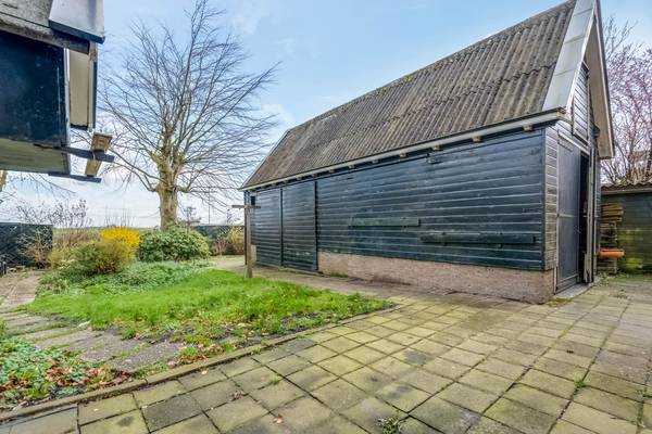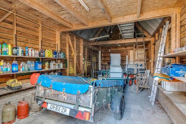 Links van de woning bevindt zich een royale schuur (voormalige timmermanswerkplaats) met een oppervlakte van circa … m² en een zolder waar vroeger de houtvoorraad werd opgeslagen. De schuur is zowel aan de voor- als achterzijde toegankelijk en biedt volop mogelijkheden voor hobby, opslag of werken aan huis. Daarnaast zijn er meerdere bijgebouwen aanwezig, waaronder een ruime garage met twee zolders en een vrijstaand kantoor met magazijn aan de achterzijde van het perceel. Deze ruimtes zijn royaal en multifunctioneel te gebruiken.